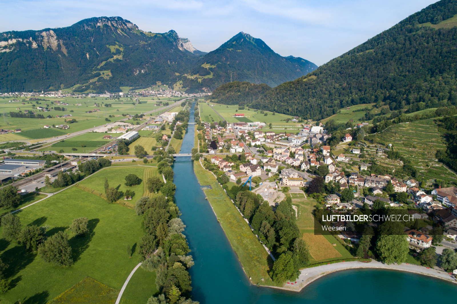 Diese Luftaufnahme zeigt den Fluss Linth entlang der Gemeinde Weesen am Walensee. Die Linth gilt als Oberlauf der Limmat. Sie liefert über zwei Drittel des Wassers aller Zuflüsse des Zürichsees, dessen Abfluss die Limmat ist. Hier bei Weesen stellt sie die Grenze zwischen dem Kanton St. Gallen und dem Kanton Glarus dar. Das Luftbild zeigt entsprechend die SBB Bahngleise sowie die Autobahn A3 in Richtung Mollis.